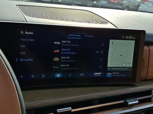- Radio: AM/FM/HD Bose Premium Audio System -inc: 12 speakers including subwoofer, external amplifier, 12.3" wide touchscreen, wireless Apple CarPlay and Android Auto, Bluetooth® hands-free w/wireless audio streaming, dynamic voice recognition, USB connectivity, SiriusXM, wifi hotspot, Blue Link connected car system, navigation system including traffic flow w/incident data via HD Radio (HERE), OTA updates and rear seat quiet mode