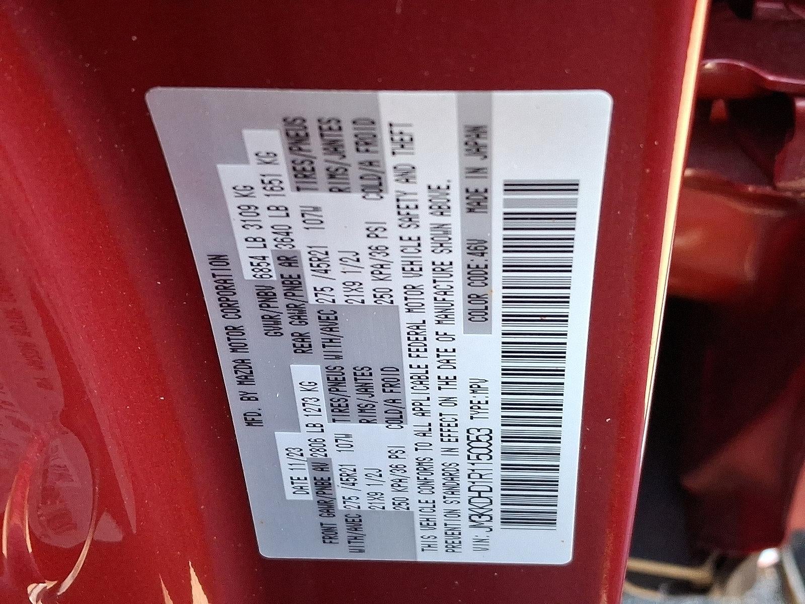 Soul Red Crystal Metallic Automatic temperature control, Electronic Stability Control, Emergency communication system: MAZDA CONNECT, Fully automatic headlights, Heated door mirrors, Heated Front Bucket Seats, Leather Shift Knob, Mazda Navigation System, Memory seat, Navigation system: MAZDA CONNECT, Power door mirrors, Power Liftgate, Power moonroof, Radio: AM/FM w/Bose Audio Sound System, Spoiler, Steering wheel mounted audio controls, Wheels: 21 x 9.5J Aluminum Alloy.