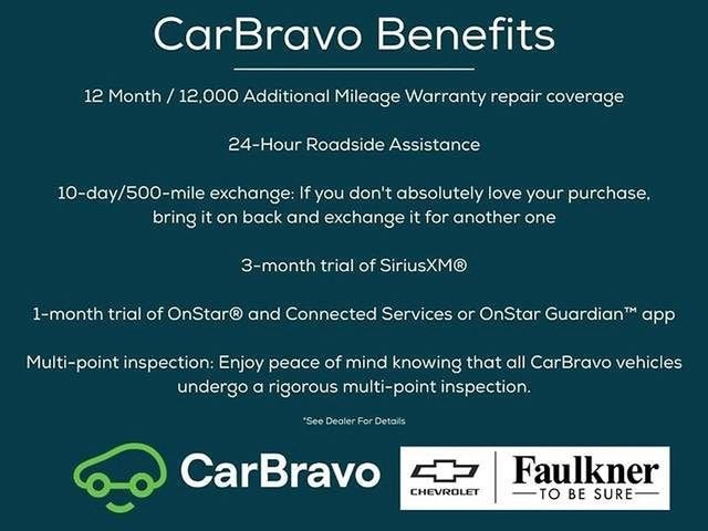 Certification Program Details: CARBRAVO Certified Pre-Owned Details: *12-month/12,000-mile * Limited Bumper-to-Bumper Warranty coverage with no deductible. * 172 Point Inspection *Courtesy Transportation Should your vehicle need warranty repair, your CarBravo dealer will make sure you have alternative transportation. *3month SiriusXM® trial subscription * with 165+ channels in the car plus access to 350+ channels on the SiriusXM® App. Enjoy commercial free music, performances and interviews, plus comedy, talk, sports and more. *Get a 1month trial of OnStar® * safety services like Automatic Crash Response, * Roadside Assistance * and the OnStar Guardian® app. * Plus, stay connected with in-vehicle data and your vehicle's mobile app. * Roadside Assistance * Vehicle History * Warranty Deductible: $0. 26/29 City/Highway MPG