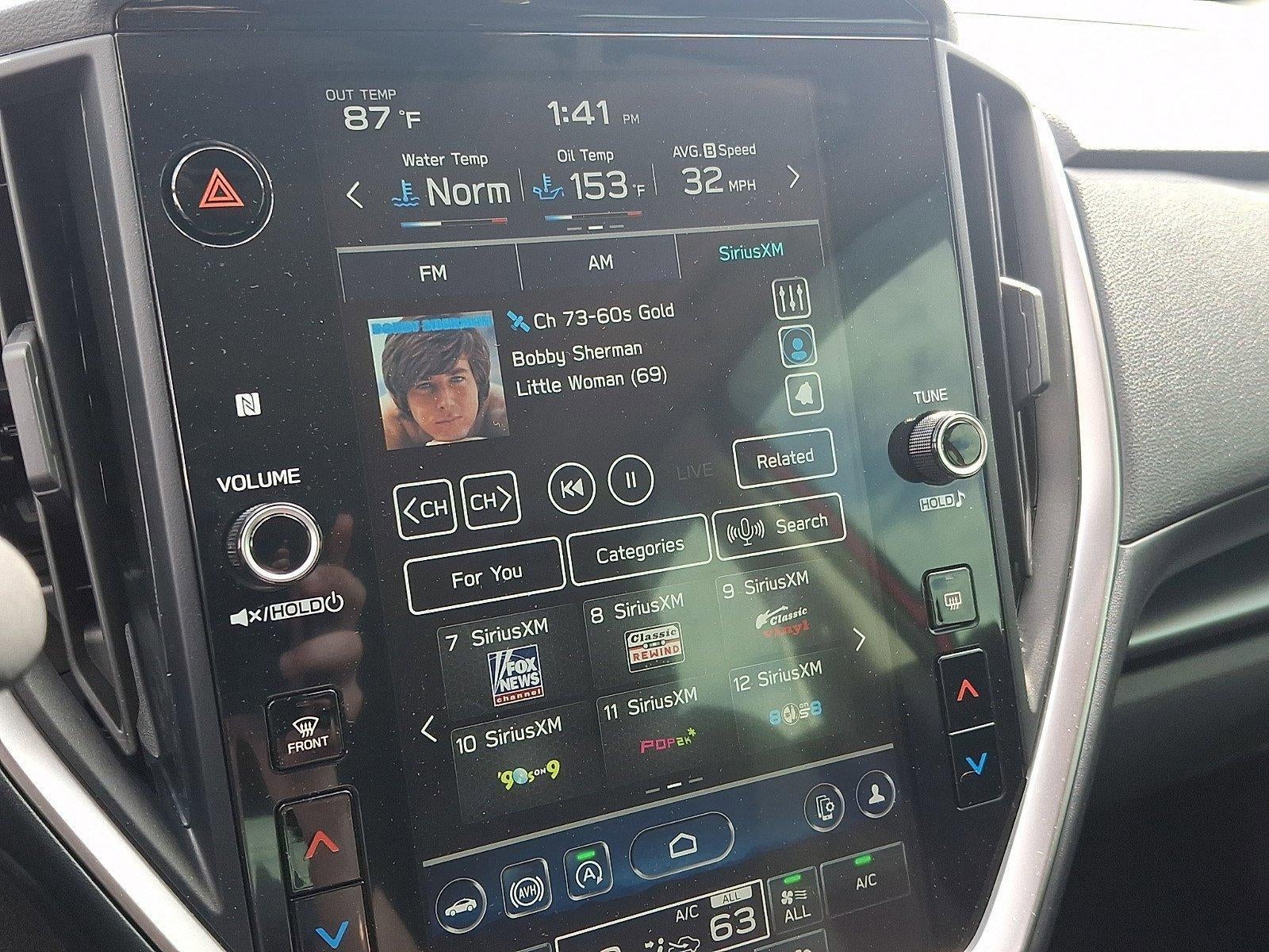 - Radio: Subaru 11.6" Multimedia Plus System -inc: valet mode, AM/FM stereo, HD Radio, multi-touch gesture high resolution display screen, voice activated controls, Bluetooth® audio streaming and hands-free phone connectivity, Bluetooth® hands-free SMS text messaging connectivity, iPod control capability, SiriusXM w/360L (4 months free trial/subscription required after), SiriusXM Travel Link (4 months free trial/subscription required after), smartphone integration: Android Auto w/full screen view and wireless connection, Apple CarPlay w/full screen view and wireless connection, USB and Over The Air (OTA) audio system update, audio system and Buletooth steering wheel control switches, 6 speakers, illuminated 3.5mm auxiliary input jack, illuminated USB A and C input charge ports, roof mounted black antenna and satellite connected services